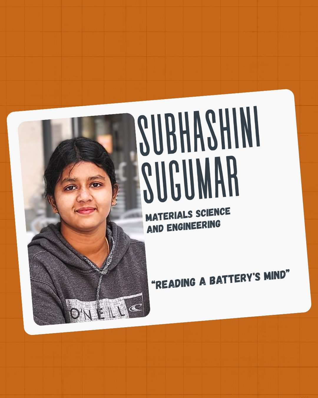 Subhashini Sugumar, a Materials Science & Engineering graduate student, won the Overall Excellence in Research Communication award for her talk, "Reading a Battery's Mind."